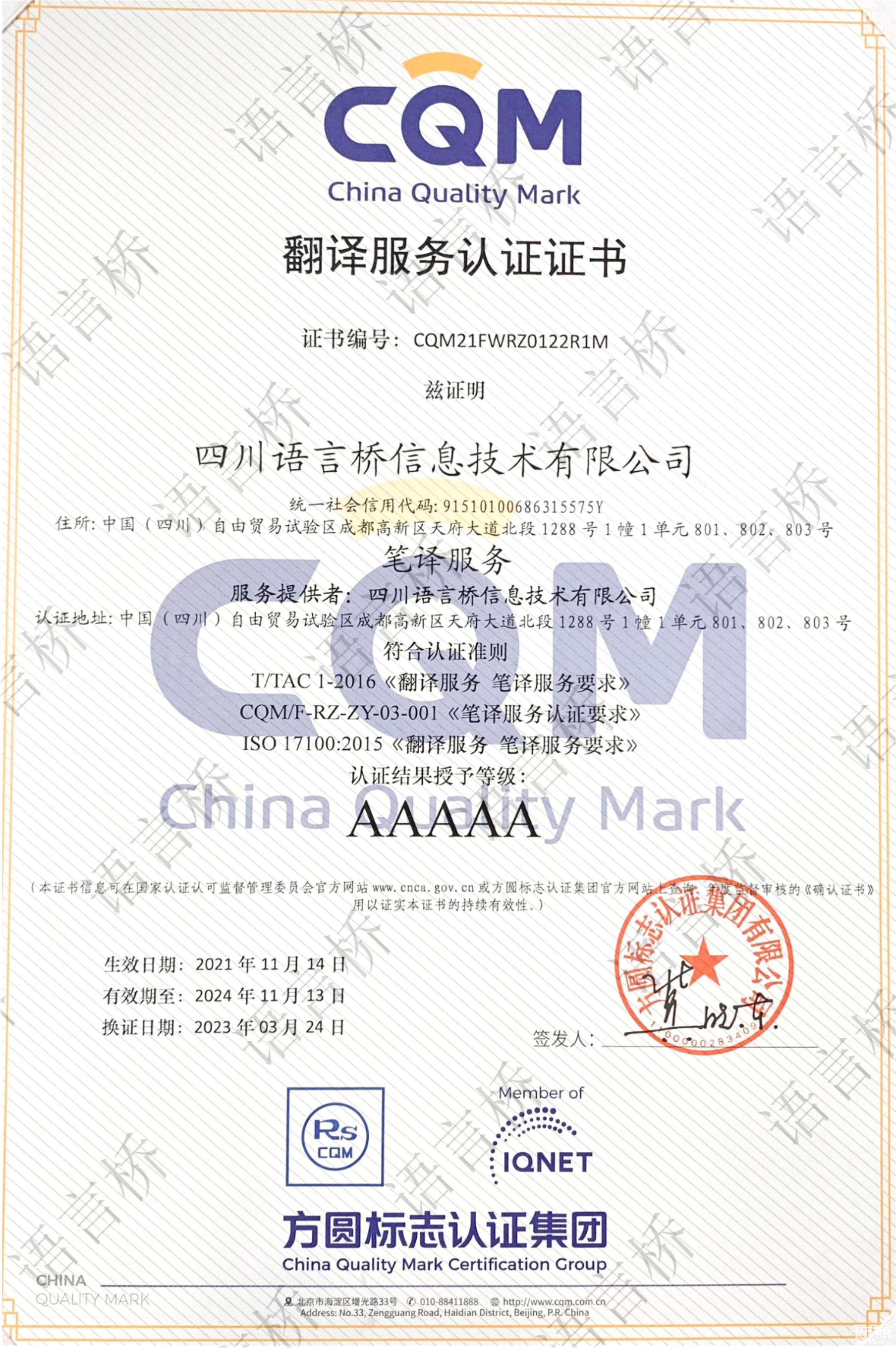為創(chuàng)新推動翻譯行業(yè)標(biāo)準(zhǔn)化的建設(shè),為創(chuàng)新推動翻譯行業(yè)標(biāo)準(zhǔn)化建設(shè),中國翻譯協(xié)會依托已發(fā)布的標(biāo)準(zhǔn)、行業(yè)規(guī)范,與專業(yè)認(rèn)證機構(gòu)共同制定了《筆譯服務(wù)認(rèn)證規(guī)范》,并由第三方認(rèn)證機構(gòu)方圓標(biāo)志認(rèn)證集團對翻譯及語言服務(wù)企業(yè)實施認(rèn)證工作,通過對翻譯企業(yè)提供的筆譯服務(wù)質(zhì)量管理能力和翻譯服務(wù)水平進行評價,證明翻譯企業(yè)的筆譯翻譯服務(wù)滿足國際標(biāo)準(zhǔn)ISO 17100-2015《翻譯服務(wù) 筆譯服務(wù)要求》、中國譯協(xié)標(biāo)準(zhǔn)T/TAC 1-2016《翻譯服務(wù) 筆譯服務(wù)要求》和方圓標(biāo)志認(rèn)證集團有限公司認(rèn)證規(guī)范CQM/F-ZY-02-001《筆譯服務(wù)要求》的要求,并達到翻譯服務(wù)水平等級(A至AAAAA)。