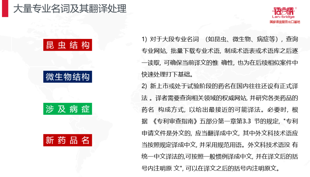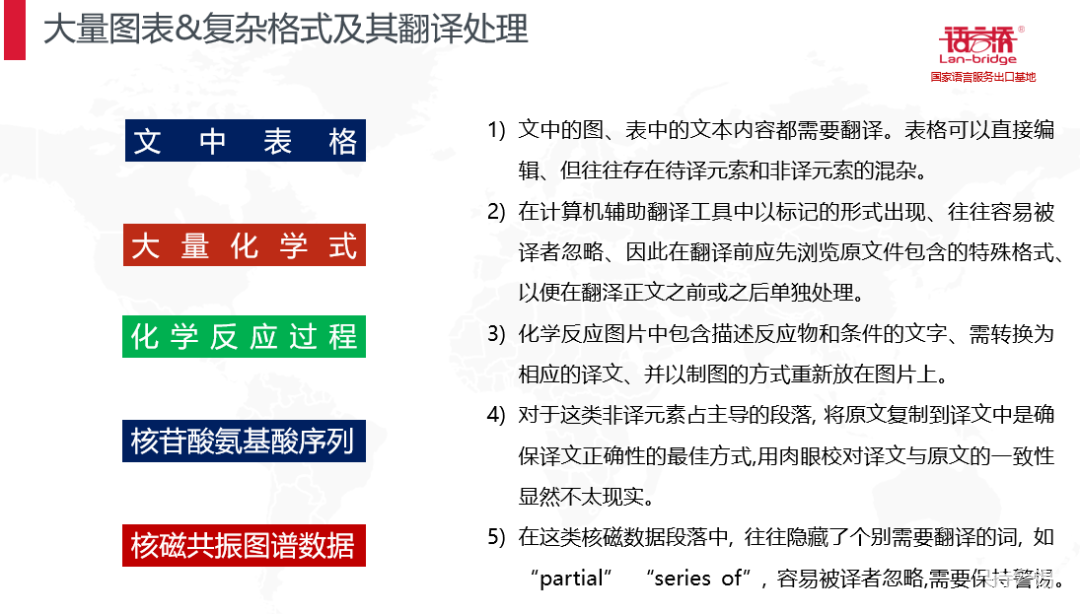 生物醫(yī)藥領(lǐng)域有大量的基團(tuán)結(jié)構(gòu),相似句式,相似表達(dá),昆蟲結(jié)構(gòu),微生物結(jié)構(gòu),涉及病癥,新藥品名稱等等,如果沒有前期的經(jīng)驗(yàn)和術(shù)語(yǔ)積累,這也將會(huì)成為翻譯路上的絆腳石,語(yǔ)言橋在這些方面做了大量的分析和儲(chǔ)備,確保譯文的高質(zhì)量輸出。